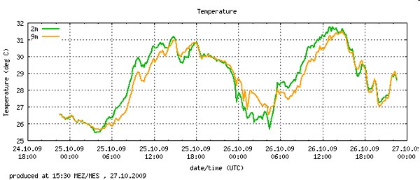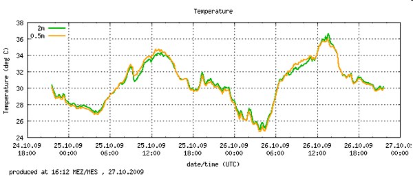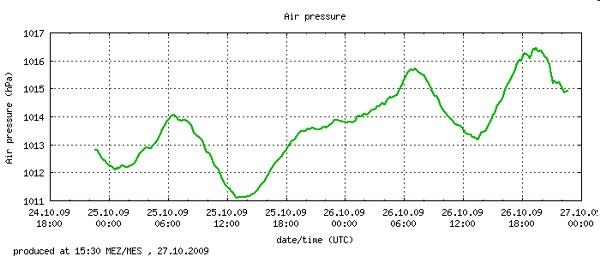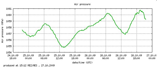 Zu Forschungszwecken führt das Institut für Meteorologie und Klimaforschung der Universität Karlsruhe seit 2006 meteorologische Messungen am Toten Meer durch (mehr zum Forschungsprojekt MASAL, inkl. Übersichtskarte). Von zwei Stationen werden zahlreiche Messdaten (u. a. Temperatur, Strahlung, relative Feuchte, Niederschlag, Luftdruck, Wind) einmal täglich nach Deutschland übermittelt und sind dann im Internet verfügbar. Ein Messort liegt unterhalb der Bergfestung Masada: Foto (1,2 MB, © IMK Karlruhe), aktuelle Daten "Masada"; der andere am Südwestufer des Toten Meeres und damit etwa 400 m unter dem Meeresspiegel: Foto (771 kB, © IMK Karlruhe), aktuelle Daten "P88/Totes Meer". Die Grafiken unten zeigen den dortigen Luftdruck- und den Temperaturverlauf am 25. und 26. Oktober 2009. Auffällig sind die ungewöhnlich hohen Luftdruckwerte von 1055 bis 1060 hPa am Toten Meer, die weltweit sonst nur in sehr starken winterlichen Hochdruckgebieten vorkommen (mehr zu den Besonderheiten des Toten Meeres im Kosmos Wetterjahr 2010 auf S. 79: pdf-File, 77 kB).