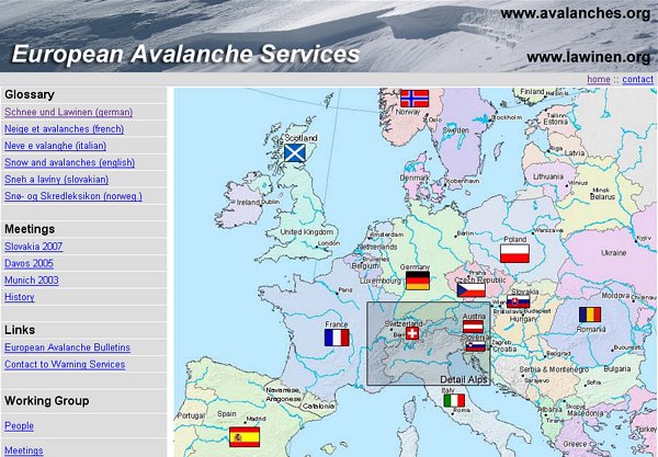 Einen schnellen Einstieg zu den Lawinenwarndiensten in den Alpen und anderen europäischen Regionen bietet das Portal avalanches.org. Außerdem gibt es hier auch ein Glossar zu Schnee und Lawinen. Hier werden alle Begriffe von der abbauenden Schneeumwandlung bis zur Zusatzbelastung erklärt (u. a. mit Fotos und Grafiken von Schneekristallen, Schneearten und Lawinentypen).