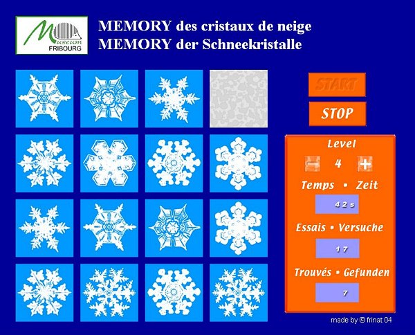 Für eine Sonderausstellung im Naturhistorischen Museum Fribourg zum Thema "Schnee und Eis" wurde ein Memory der Schneekristalle mit acht verschiedenen Kristallformen entwickelt. Das Begleitheft zur Ausstellung gibt es als pdf-File (672 kB).