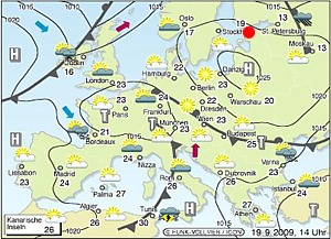 Am Rande eines Hochdruckgebiets war am 19. September 2009 in Estland (siehe rote Markierung in der Wetterkarte) die Luft in höheren Schichten warm und trocken, so dass die Quellwolken an diesem Tag recht flach blieben (Wetterkarte: © Funk-Vollmer-Wetter/Icon).